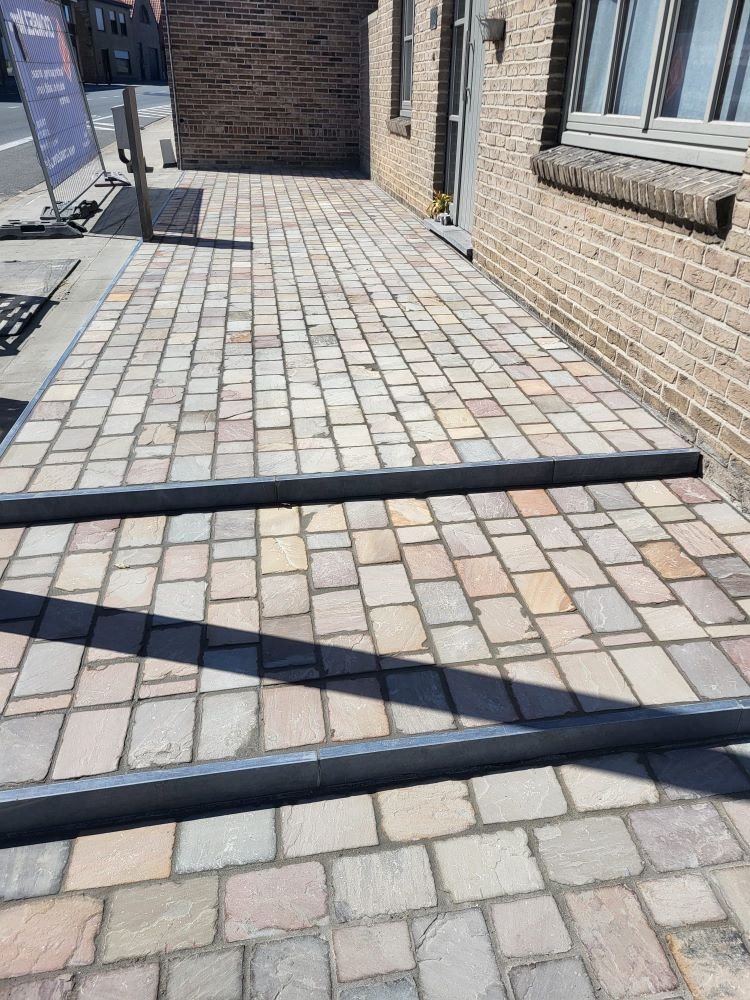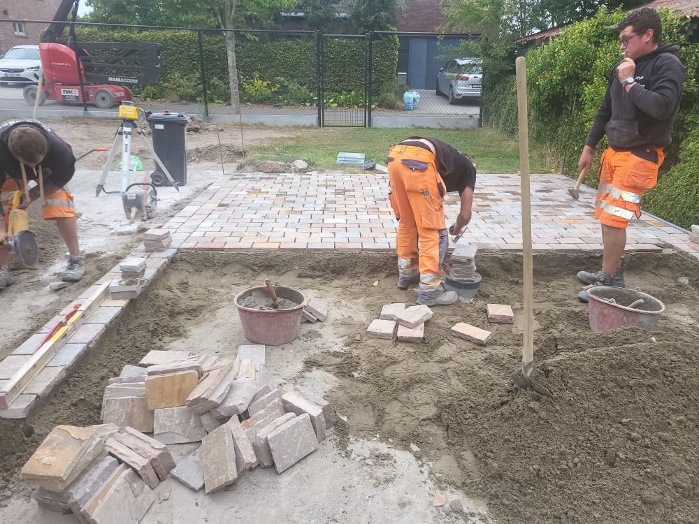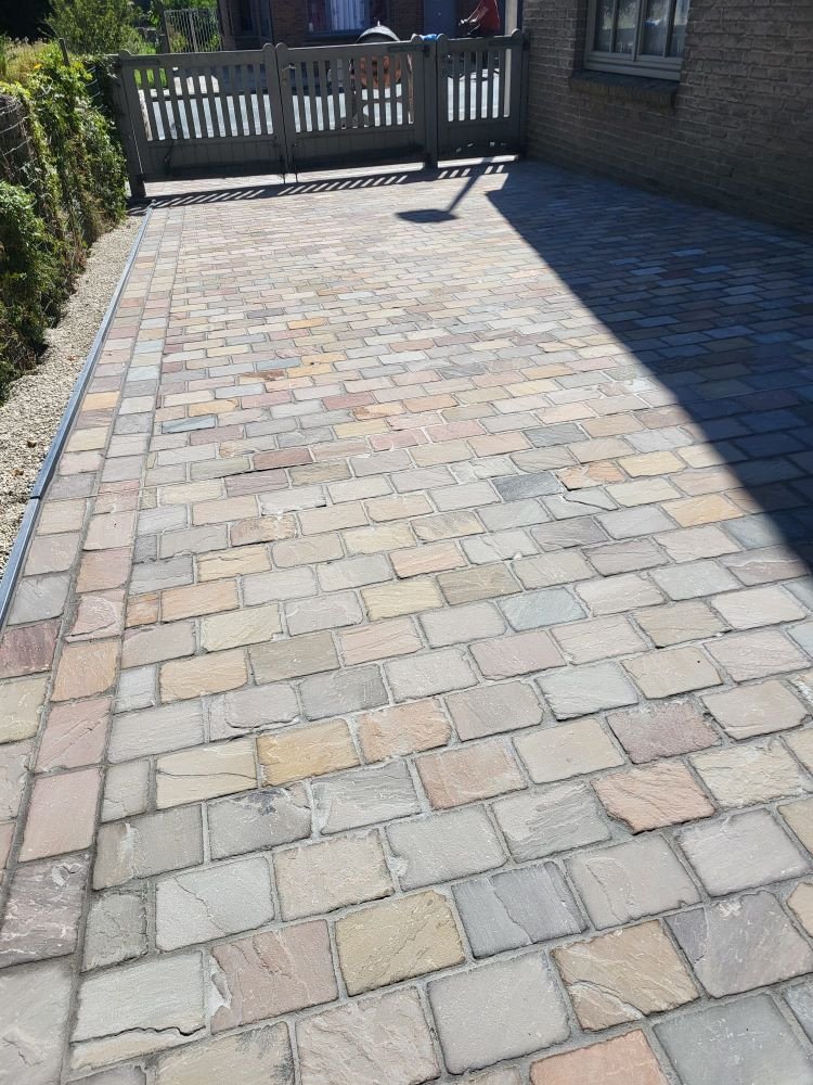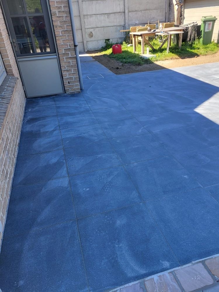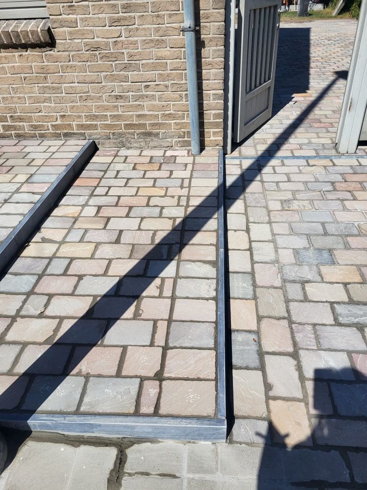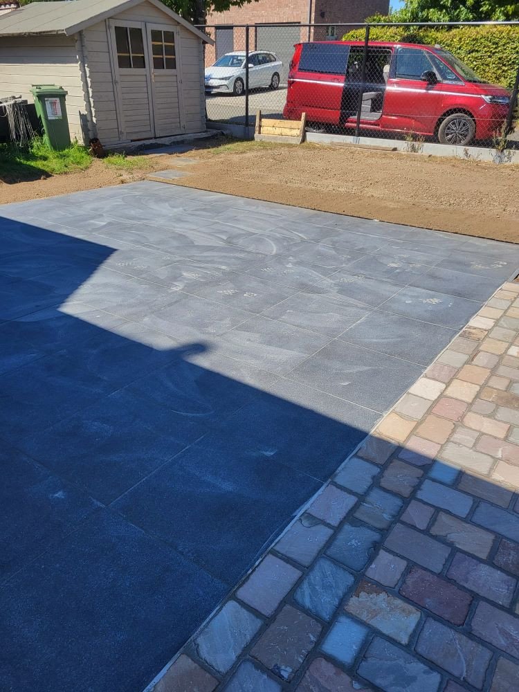 aanleg inrit en terras kandla bruin en keramische tegels Esen